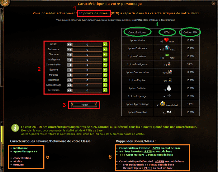 Une fois vos caractéristiques validées via le bouton « Valider », aucun retour en arrière n'est possible, il faut donc bien réfléchir avant de valider. Cependant, vous n’êtes pas obligé de dépenser tous vos PTN à chaque fois.