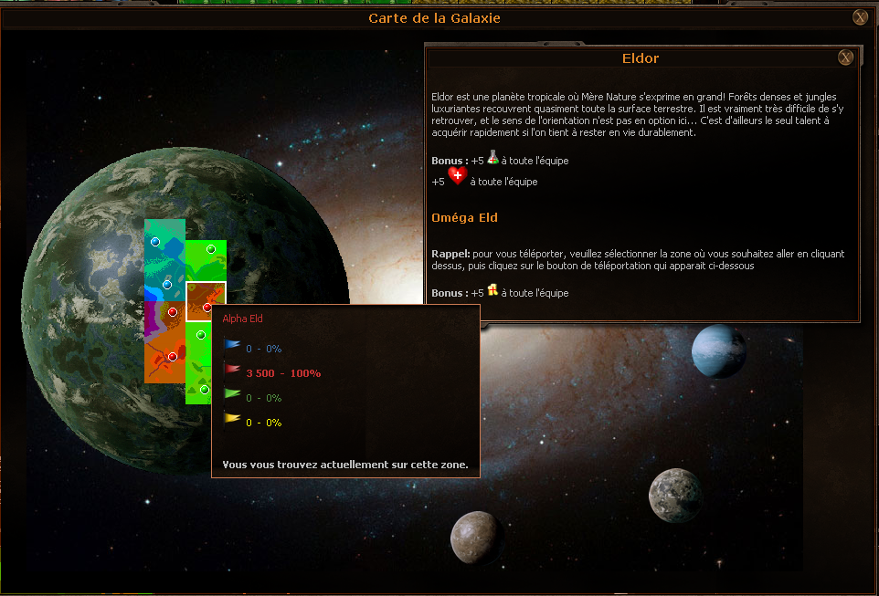 En cliquant sur une planète, vous retrouvez dans le cadre qui apparaitra, le bonus en question, ainsi que le nom et une description de la planète sélectionnée. Vous aurez également une vue de la possession des zones par les différents camps (le pourcentage d'influence s'affiche au survol de la zone par la souris).